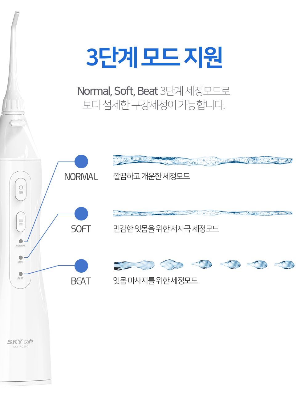 일반세정(NORMAL), 부드러운 세정(SOFT), 잇몸 마사지(BEAT) 3가지 모드가 있어