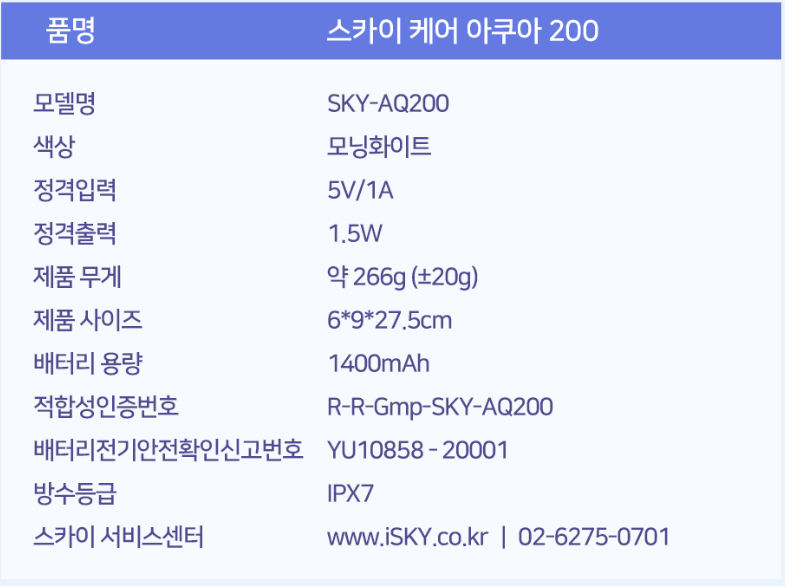 [스카이아쿠아200 구강세정기 제원]