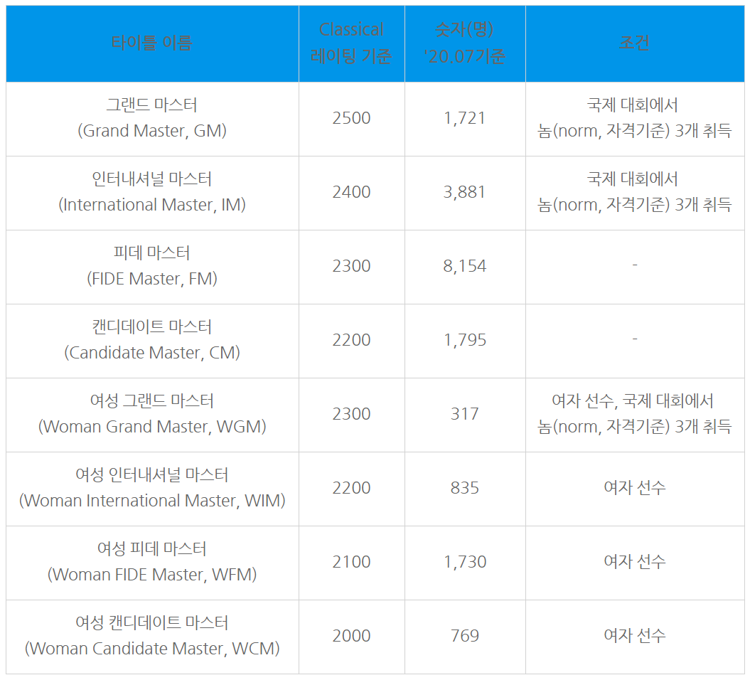 가장 권위 있는 타이틀은 세계체스연맹(FIDE)에서 발행되며