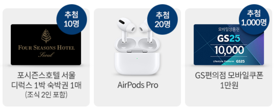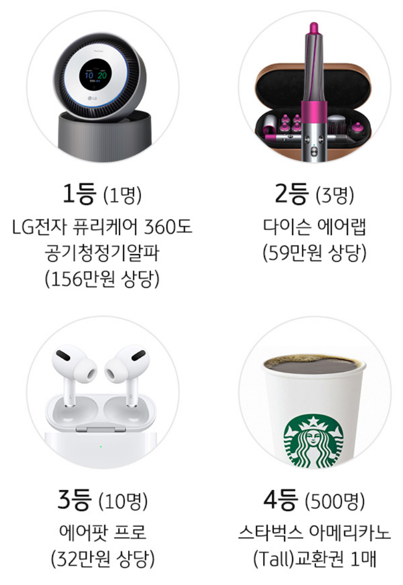또는 LG 공기청정기, 다이슨 에어랩, 에어팟 프로 등을 추첨을 통해 증정하며