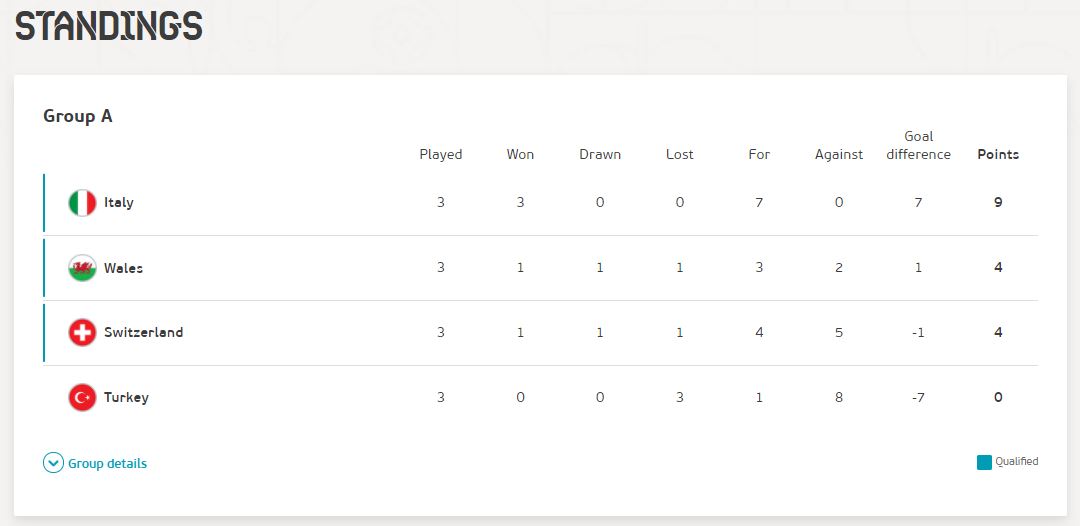 A 그룹 : 이탈리아, 웨일즈, 스위스