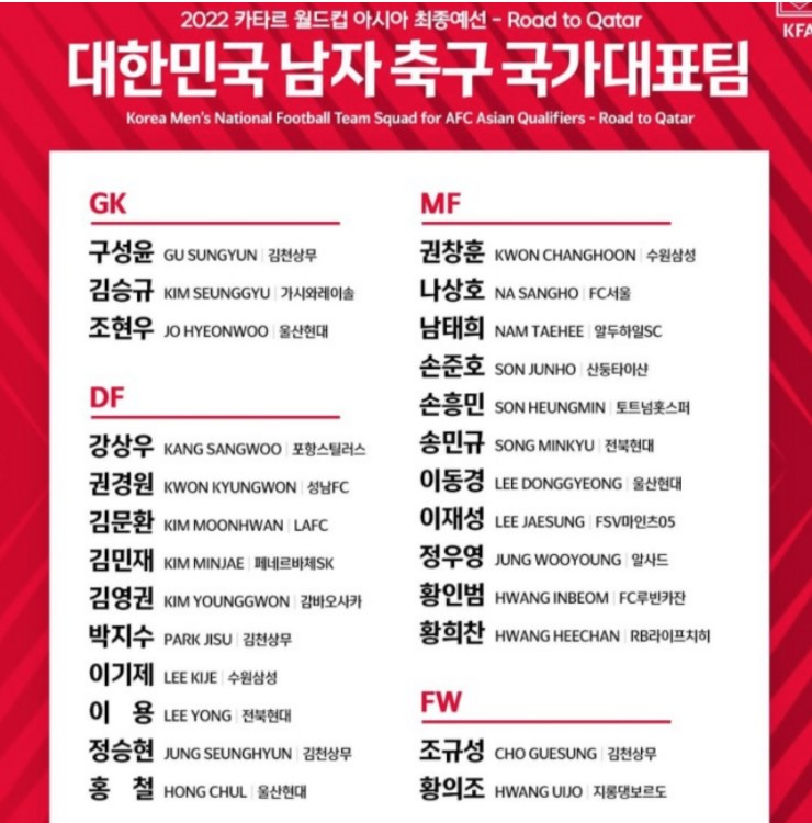 최종예선은 손흥민(토트넘), 황의조(보르도), 김민재(페네르바체) 등