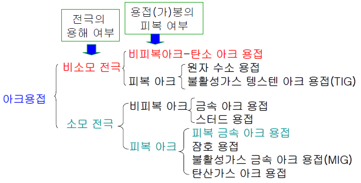 (1) 피복 금속 아크 용접 : 소모 전극 사용(전극이 용융됨: 전극=용접봉) / 용접봉이 피복