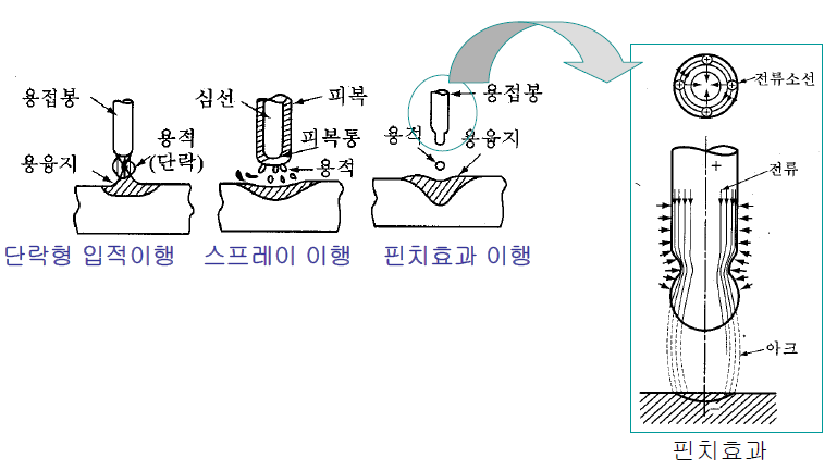 → 핀치 효과(Pinch Effect)에 의해 용접봉 융융부의 일부가 절단되어 떨어져 나가 모재로 이행되는 방식