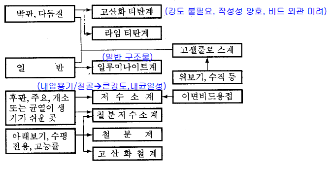 - 작업 시 알맞은 용접봉의 선택 (피복제의 계통에 따른)