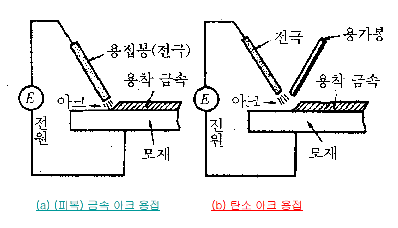 ▩ (피복) 금속 아크 용접과 탄소 아크 용접의 구조 비교