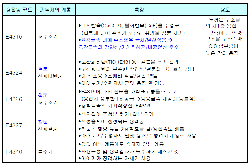 - 작업 시 알맞은 용접봉의 선택 (피복제의 계통에 따른)