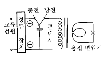 - 콘덴서에 전기적 에너지 비축 → 용접할 두 소재를 접촉 → 1/1000초 이내에 비축된 전기에너지를 금속 접촉면에