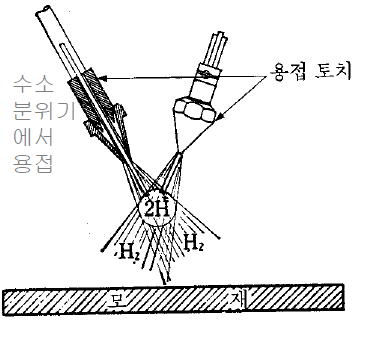 - 텅스텐 전극봉으로 아크 발생 → 분자 수소 → 원자 수소 → 소재 표면에서 냉각 → 분자 수소로 재결합 → 방출 열