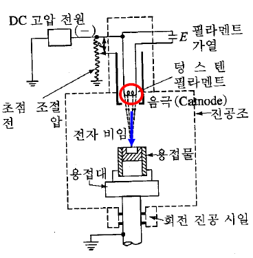- 고 진공 속에서 적열 된 필라멘트에서 전자빔을 접합부에 조사하여 그 충격 열을 이용하여 용융 용접하는 방법