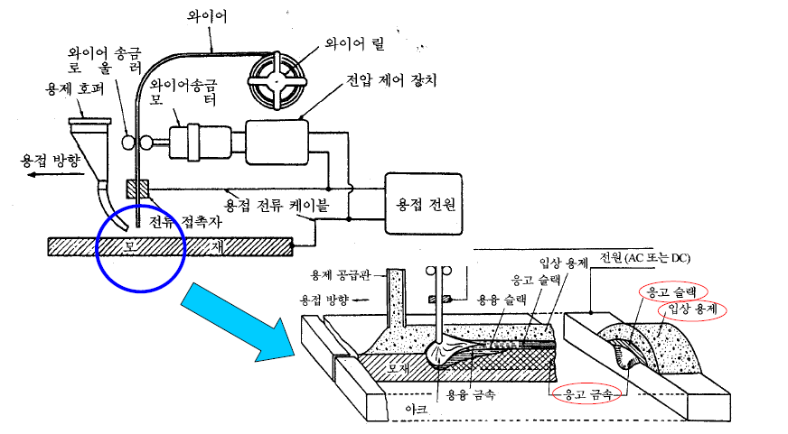 - 용접봉 바로 앞의 용제 호퍼에서 용접봉 진행에 따라 연속적으로 다량의 용제 공급