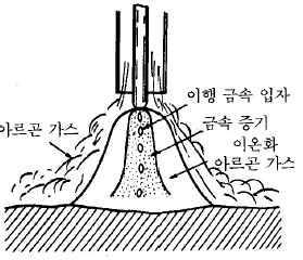 ▷ 정극성 : 아르곤의 양이온 및 모재에서 방출되는 금속 양이온이 전극으로 이동되는 중 서로 충돌 →